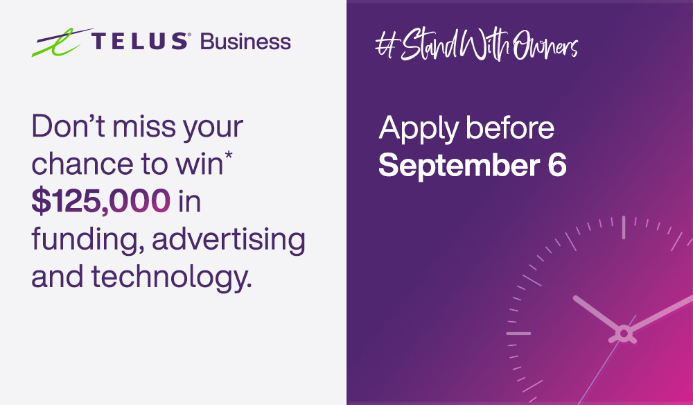 DESCRIPTION:TELUS is searching for game-changing business ownersApply before September 6The TELUS #StandWithOwners application is open to revenue-generating Canadian businesses with 1-100 employees. For-profit\, not-for-profit and social enterprises are eligible to apply.The application is open to small business applicants who are residents of Canada and have reached the age of majority according to the laws of the Province where they reside.Prizes include:5 grand prize winners receive $125\,000+ in funding plus recognition and advice customized to their business needs\, with our TELUS advisory council15 finalists receive $20\,000 in funding plus recognition and exposure to spotlight their business storiesReady to fuel your business growth?  Learn more