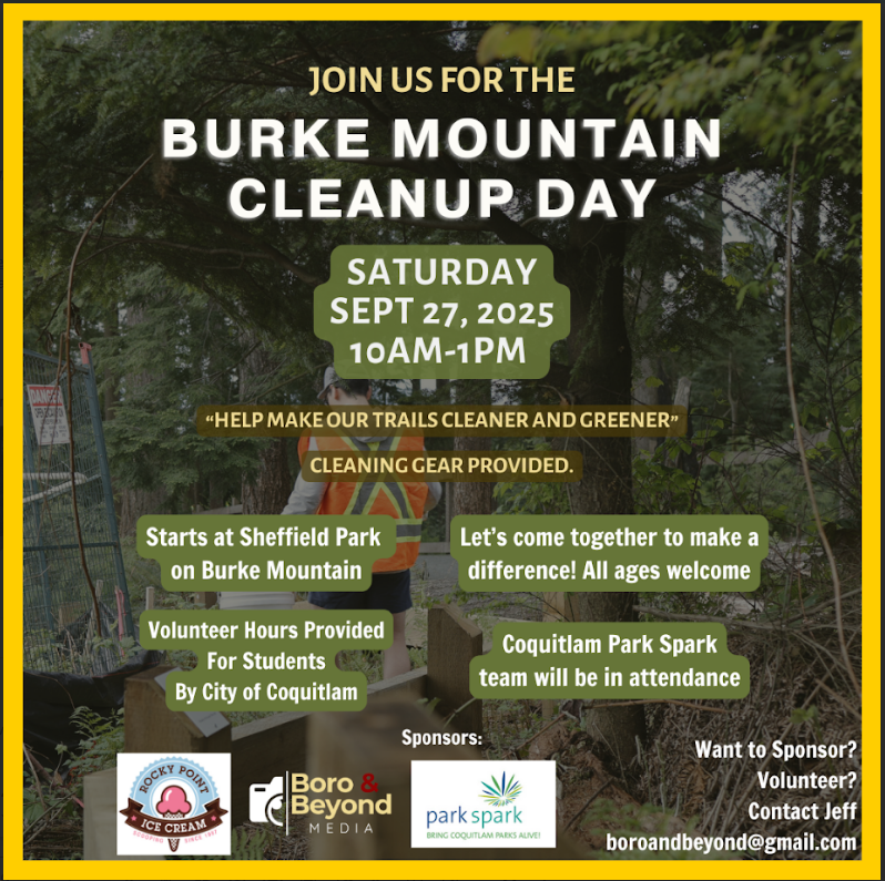 Burke Mountain Cleanup Day, happening on Saturday, September 27, 2025, from 10 a.m. to 1 p.m., starting at Sheffield Park.This community-led event, in partnership with the City of Coquitlam’s Park Spark program, will bring together residents, families, and students to help clean and preserve the natural beauty of Burke Mountain’s parks, trails, and waterways.